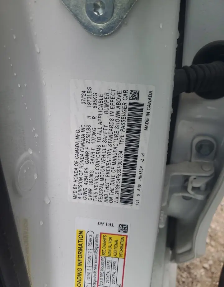 This Honda Civic 2025 White was originally purchased at one of the major insurance auctions in the United States or Canada. The vehicle history is tied directly to its VIN code, which makes it possible to track the origin, condition, and circumstances of the sale. The photographs provided represent the actual state of the car at the moment of auction and serve as an important visual record of its technical and cosmetic condition.